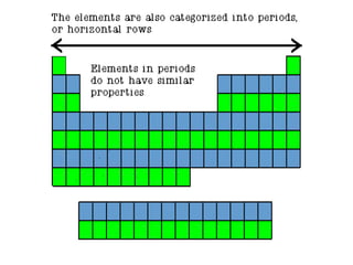 The periodic table organizes the 118 known chemical elements according to their atomic structure. Elements are arranged by atomic number, symbols, atomic mass, and other properties like valence electrons. This allows scientists to predict elements' chemical and physical behaviors, as elements in the same families on the periodic table have similar properties. The periodic table is a useful tool for understanding the building blocks of all matter in the universe.
