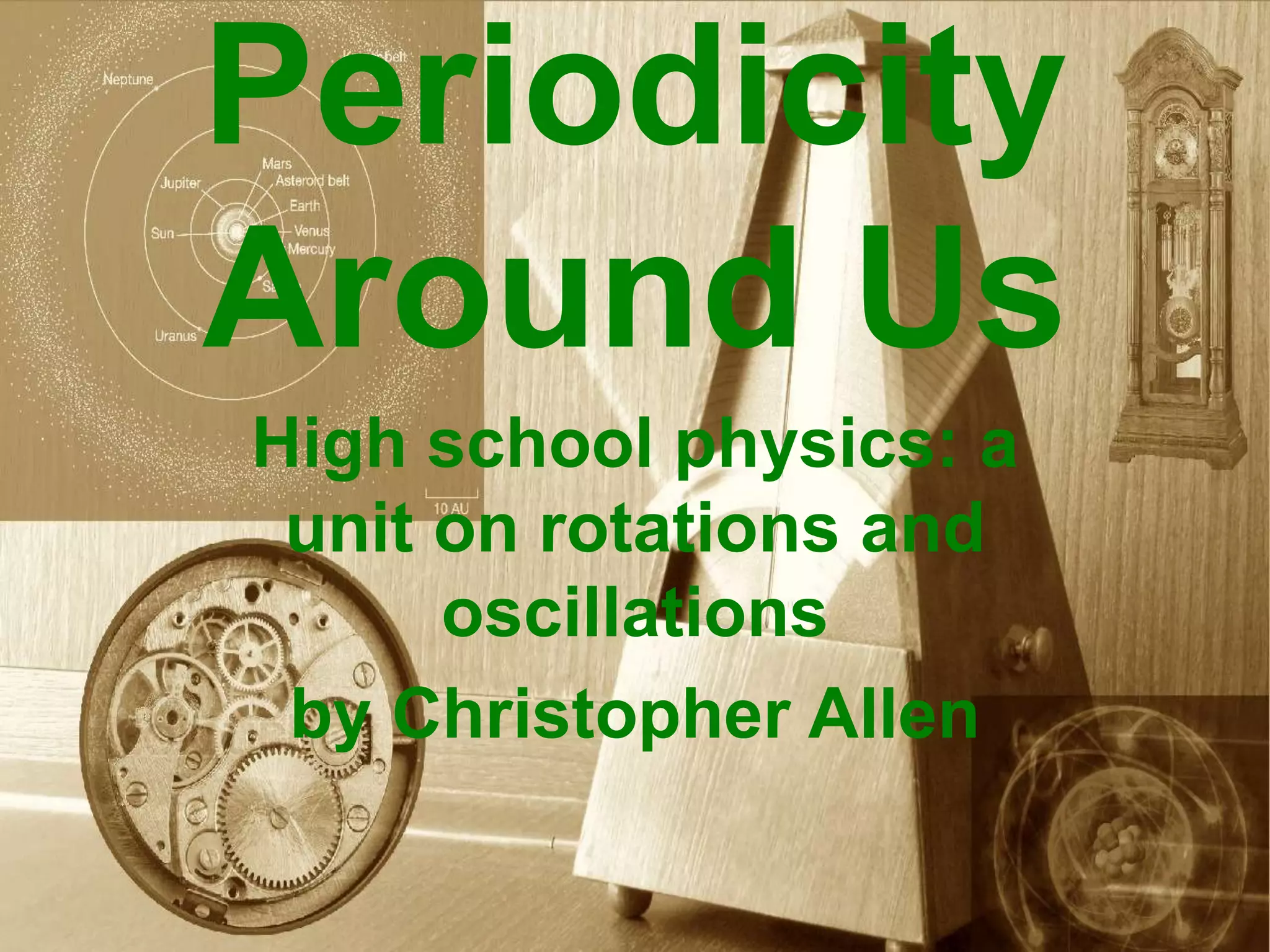 This document outlines a high school physics unit on rotations and oscillations that covers circular motion, pendulums, and spring-mass oscillators. The unit explores key concepts for each topic such as period, frequency, amplitude, energy, and free-body diagrams or graphs.