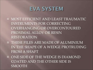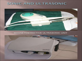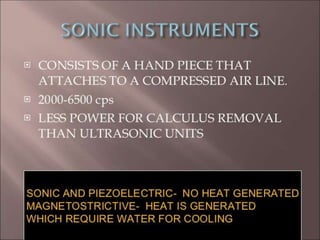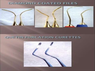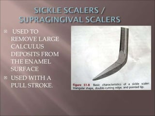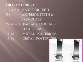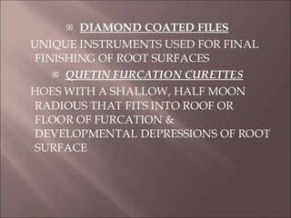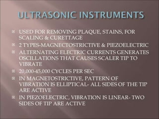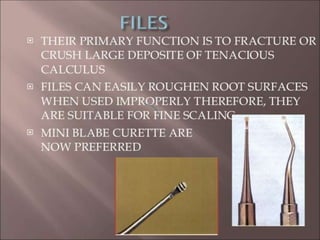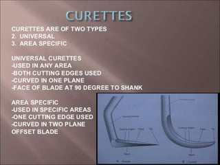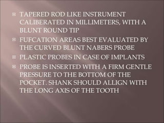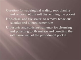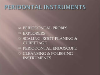 Periodontal instruments are used in dental procedures to clean and examine areas below the gumline. Probes are used to visualize deep pockets and detect deposits that cannot be seen. Scalers remove tartar and smooth root surfaces after deep cleaning. The document discusses types of periodontal instruments and their uses in examining and treating areas below the gumline.