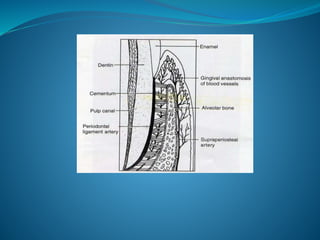 This document provides an overview of the periodontal ligament (PDL), including its development, cells, extracellular components, fiber groups, and structures. The PDL is a specialized connective tissue that attaches teeth to alveolar bone. It contains fibroblasts that secrete collagen fibers, along with blood vessels, nerves, and progenitor cells. The principal fiber groups resist various forces on teeth. The PDL allows teeth to withstand chewing forces through its extracellular matrix and continual remodeling by synthetic and resorptive cells.