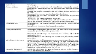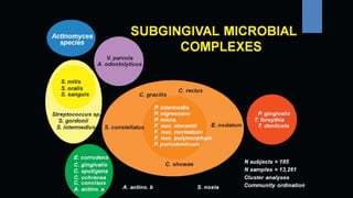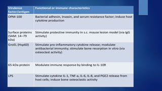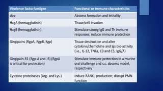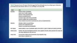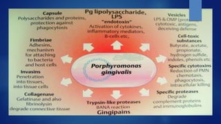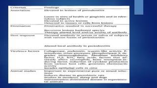 The document discusses periodontal pathogens and their role in periodontitis, a polymicrobial disease involving complex interactions between oral microorganisms and the host immune response. It explains the criteria for identifying these pathogens, particularly focusing on key species such as Aggregatibacter actinomycetemcomitans and Porphyromonas gingivalis, which fulfill the established criteria for periodontal pathogens due to their virulence factors and association with disease. Additionally, it highlights the challenges in defining these pathogens due to the complexity of the subgingival microbiota and the mixed infections that can occur.
