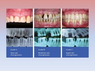 The document provides a comprehensive overview of periodontitis, defining it as a chronic inflammatory disease marked by the destruction of the tooth-supporting apparatus due to dysbiotic plaque biofilms. It presents various classifications of periodontitis, including chronic and aggressive types, diagnosis criteria based on clinical attachment loss, and the latest updates to classification systems based on severity and grade. Key features for diagnosis and management of periodontitis are detailed, alongside risk factors and distinctions between different forms of periodontal diseases.