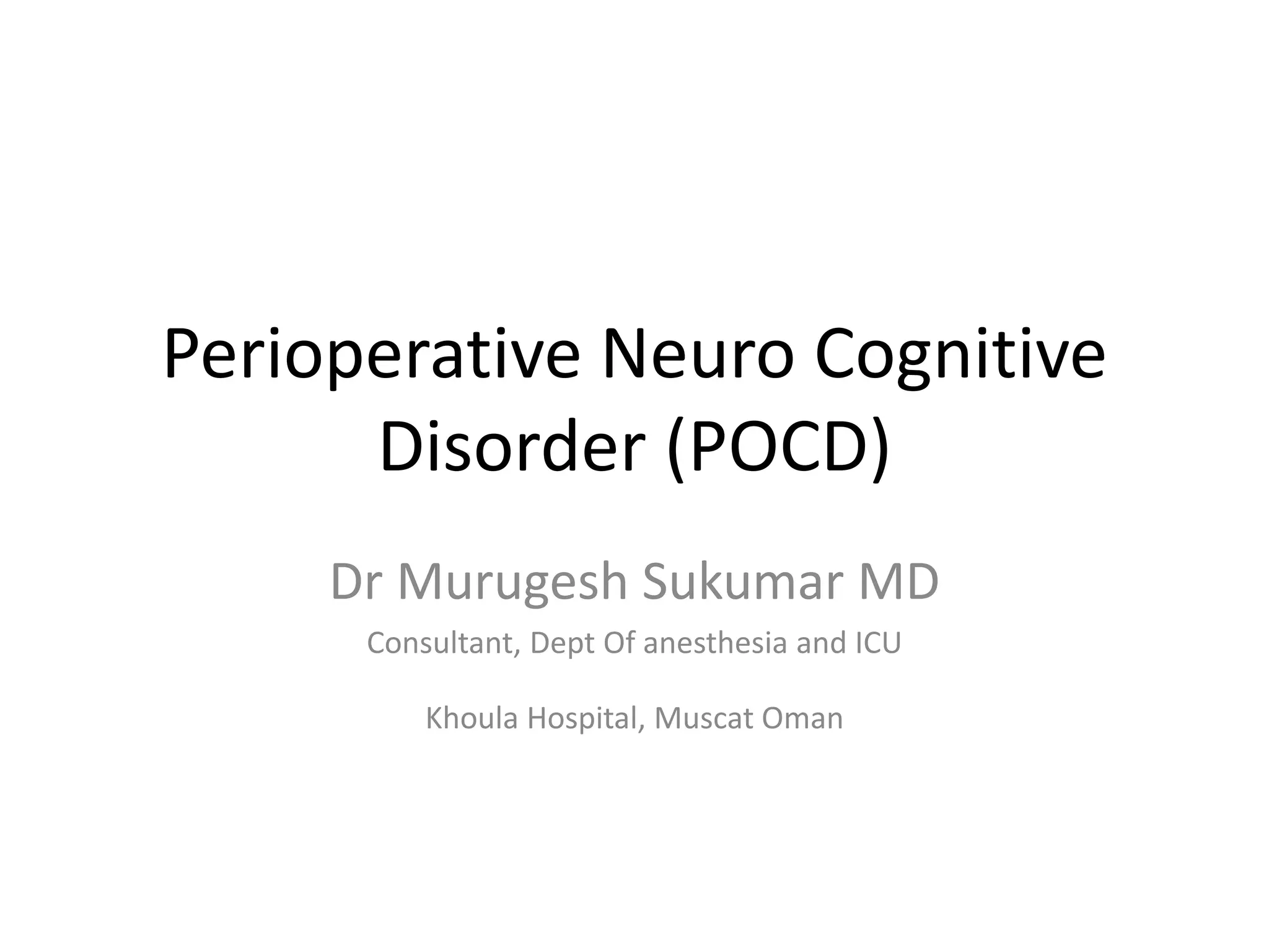 POCD is defined as impairment of cognitive function after surgery. It can occur in the immediate postoperative period as postoperative delirium or emerge later as delayed neurocognitive recovery or PONCD. The reported incidence ranges from 5-60% depending on the surgery and assessment time period. Risk factors include increasing age, pre-existing cognitive impairment, major surgery and cardiac surgery specifically. Prevention strategies involve a multidisciplinary approach with careful preoperative assessment, avoidance of delirogenic medications, monitoring anesthesia depth, early mobilization and multicomponent prevention programs. Treatment of established POCD focuses on managing symptoms though efficacy is limited.