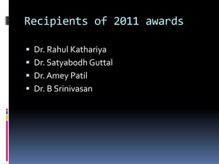 The PerioIndia Awards 2011 honored four recipients for their significant contributions to dentistry in periodontics and implantology: Dr. Rahul Kathariya, Dr. Satyabodh Guttal, Dr. Amey Patil, and Dr. B. Srinivasan. Dr. Kathariya is recognized for his extensive publications and roles as a peer reviewer, while Dr. Guttal is acknowledged for his innovative approaches in prosthodontics. Dr. Patil's invention of a pico-hydroelectric toothbrush showcases a novel energy-harvesting technology, and Dr. Srinivasan has notable achievements in maxillofacial prosthodontics.