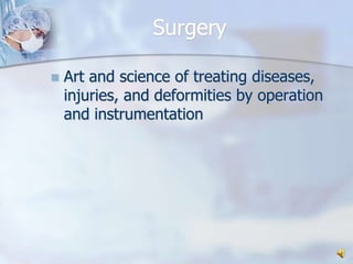This document outlines preoperative, intraoperative, and postoperative nursing care for surgical patients. It discusses the nursing assessment process including health history, physical exam, and psychosocial evaluation. Key parts of the nursing management are preoperative teaching, informed consent, preparing patients for surgery, and providing care in the operating room, PACU, and postoperative units. Potential postoperative complications are reviewed for multiple body systems along with the corresponding nursing care.
