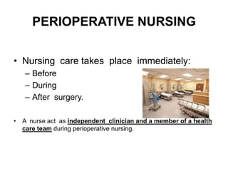 1. Perioperative nursing involves nursing care before, during, and after surgery. The goals are to assist clients through the surgical experience and help promote positive outcomes and optimal function.