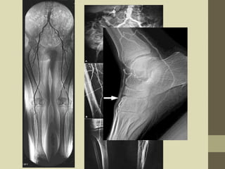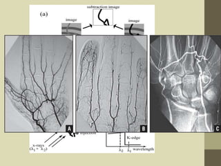 Peripheral angiography is a radiological procedure used to examine arteries and veins after injecting contrast media. It involves puncturing an artery such as the femoral artery using the Seldinger technique and threading a catheter over a guidewire to inject contrast media and obtain images. The procedure is used to diagnose and treat various vascular conditions. Precise positioning, sterile equipment and contrast injection are needed to obtain diagnostic images of the peripheral vasculature.