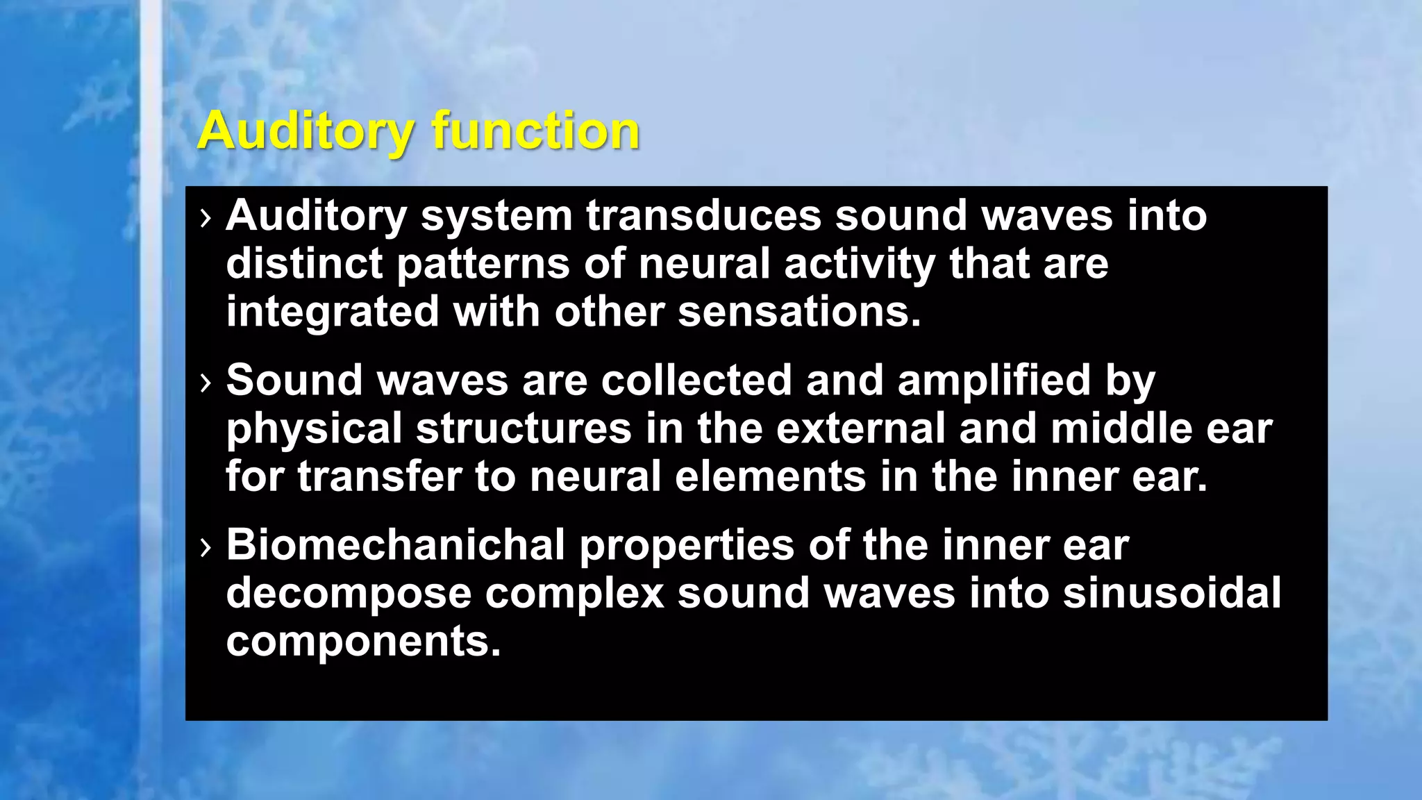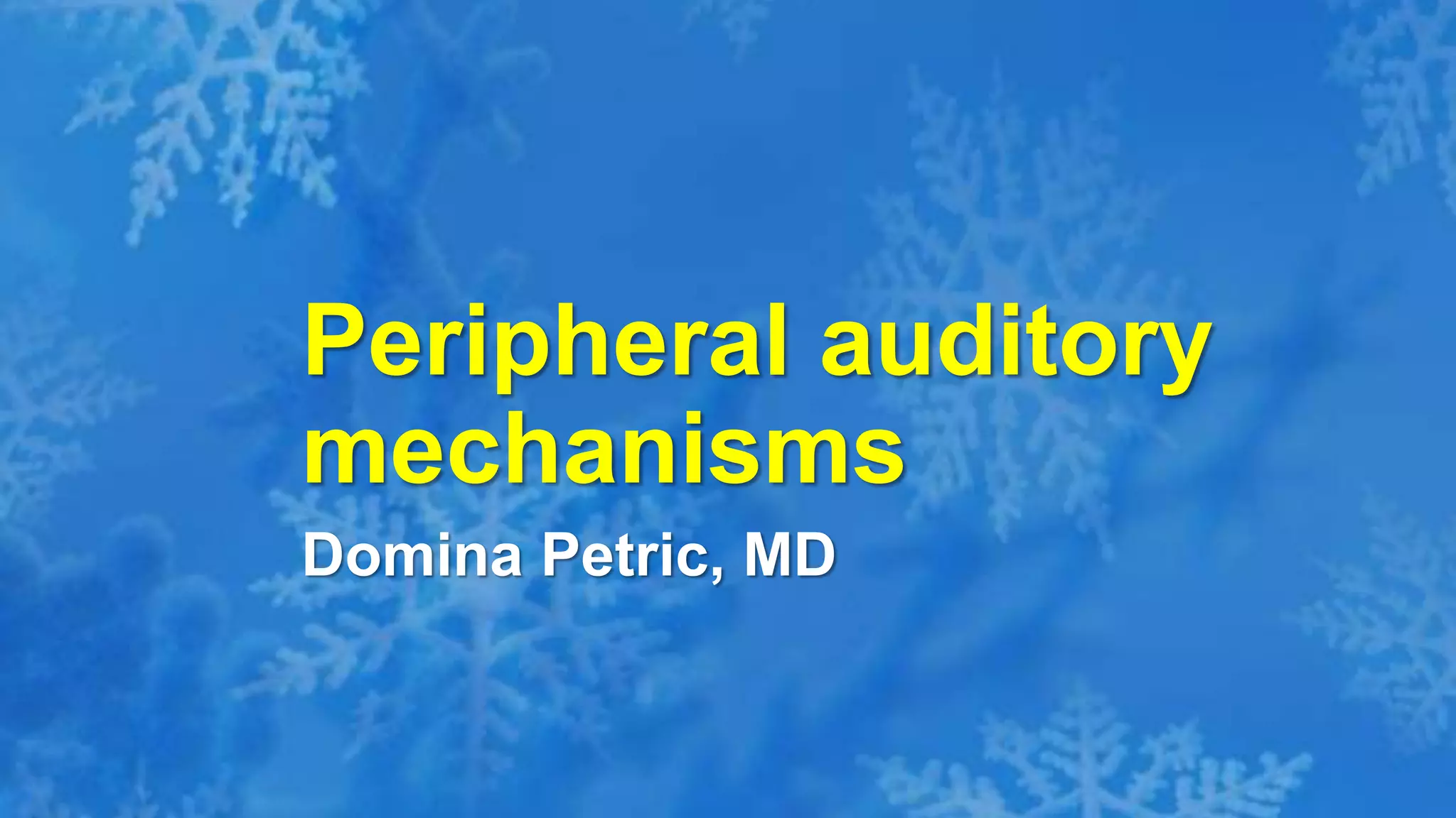 The document summarizes the peripheral auditory system and mechanisms of hearing. Sound waves are collected by the outer and middle ear and transferred to the inner ear. In the inner ear, the cochlea decomposes sound waves into frequencies which are encoded by hair cells. This information is transmitted through the auditory nerve and processed in the brainstem, midbrain, and auditory cortex. The cochlea uses tonotopic organization to transmit frequencies to the brain in an organized way.
