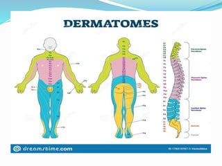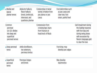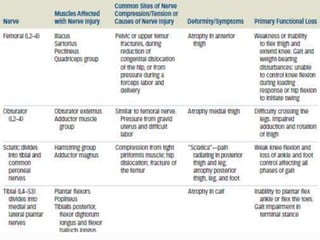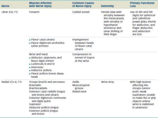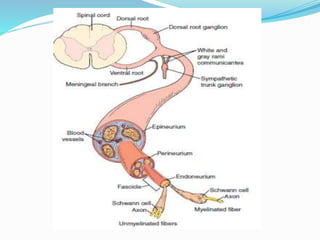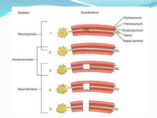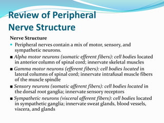 This document provides an overview of peripheral nerve structure and common sites of injury. It discusses the different types of neurons that make up peripheral nerves, including motor, sensory and sympathetic neurons. Common sites where peripheral nerves can be injured include the intervertebral foramina, brachial plexus and lumbosacral plexus. Mechanisms of nerve injury include compression, laceration, stretch and radiation. The document also outlines guidelines for managing nerve injuries in the acute, recovery and chronic phases.