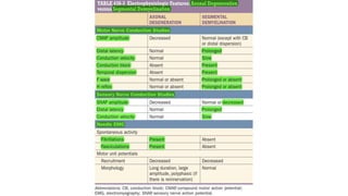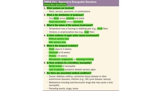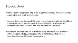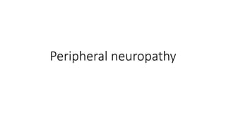 Peripheral neuropathies can affect the cell body, myelin sheath, or axon. When evaluating a patient with neuropathy, the clinician aims to identify where the lesion is located, determine the cause, and prescribe proper treatment. Electrodiagnostic studies and nerve biopsies help classify the neuropathy and diagnose underlying causes like diabetes, autoimmune diseases, toxins, vitamins deficiencies, infections, and malignancies. Cryptogenic neuropathies have no known cause and treatment focuses on managing neuropathic pain symptoms.