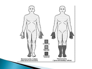 3. It describes the clinical presentations of different types of peripheral neuropathies based on the affected nerves and provides examples.