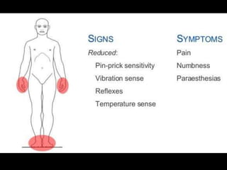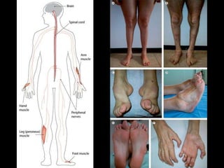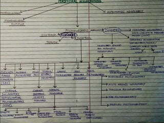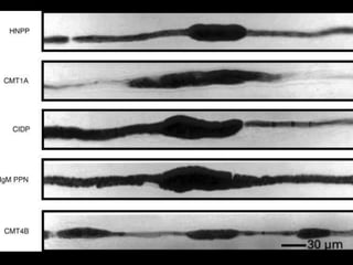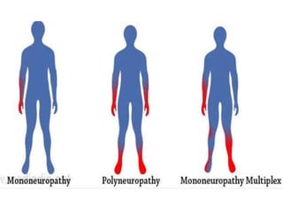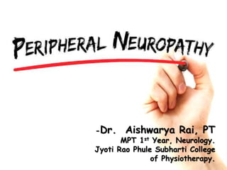 II. Peripheral neuropathies can be acquired through systemic diseases, trauma, infections, or inherited genetically. Common acquired neuropathies include diabetic neuropathy, Guillain-Barré syndrome, chronic inflammatory demyelinating polyneuropathy, and alcoholic neuropathy. Inherited forms include Charcot-Marie-Tooth disease and hereditary liability to pressure palsies.