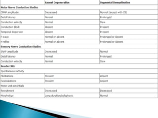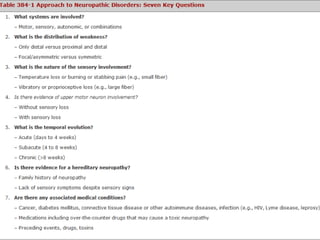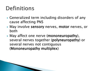 This document provides an overview of peripheral neuropathies. It discusses that peripheral neuropathies can involve sensory nerves, motor nerves, or both, and may affect single or multiple nerves. The document then covers the clinical presentation and classification of different types of neuropathies, including those that primarily affect the cell body, myelin, or axon. It also lists common causes of peripheral neuropathies like diabetes, paraproteinemia, alcohol misuse, and discusses their prevalence. The temporal course, symptoms, and assessment of peripheral neuropathies are discussed in detail.