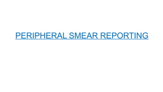The document outlines the indications and methodology for peripheral smear examination, which assesses the morphology and cellularity of blood components. It details the evaluation of red blood cells, white blood cells, and platelets, along with various abnormalities such as rouleaux formation, agglutination, and multiple types of cells observed in different conditions. The document also provides specific descriptions for various blood cell shapes and their clinical significance.