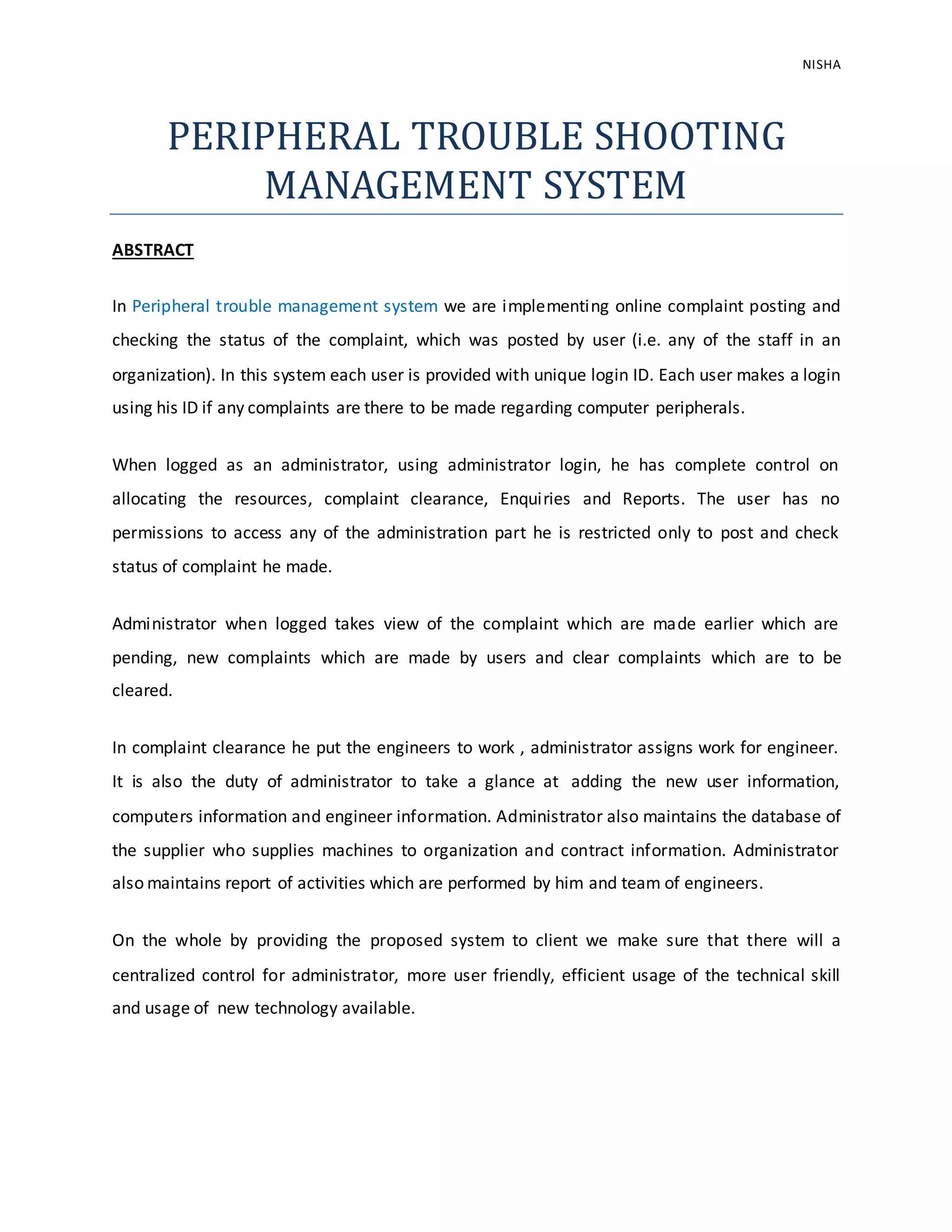 The document describes a proposed peripheral troubleshooting management system that allows users to log in, submit complaints about computer peripherals, and check the status of submitted complaints. An administrator can view and assign complaints, add/update user, system, and engineer details, and generate reports. The system aims to provide centralized control, improve efficiency, and utilize technical skills and new technology.
