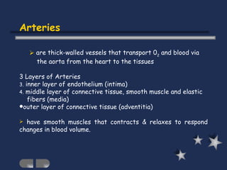This document summarizes peripheral vascular diseases, including arterial and venous disorders. It describes the anatomy and physiology of arteries and veins. Common peripheral vascular diseases are then discussed, including atherosclerosis, thromboangitis obliterans, Raynaud's phenomenon, aneurysms, arterial embolism, and venous disorders like thrombophlebitis. Risk factors, clinical manifestations, diagnostic tests, and management approaches are provided for each condition.
