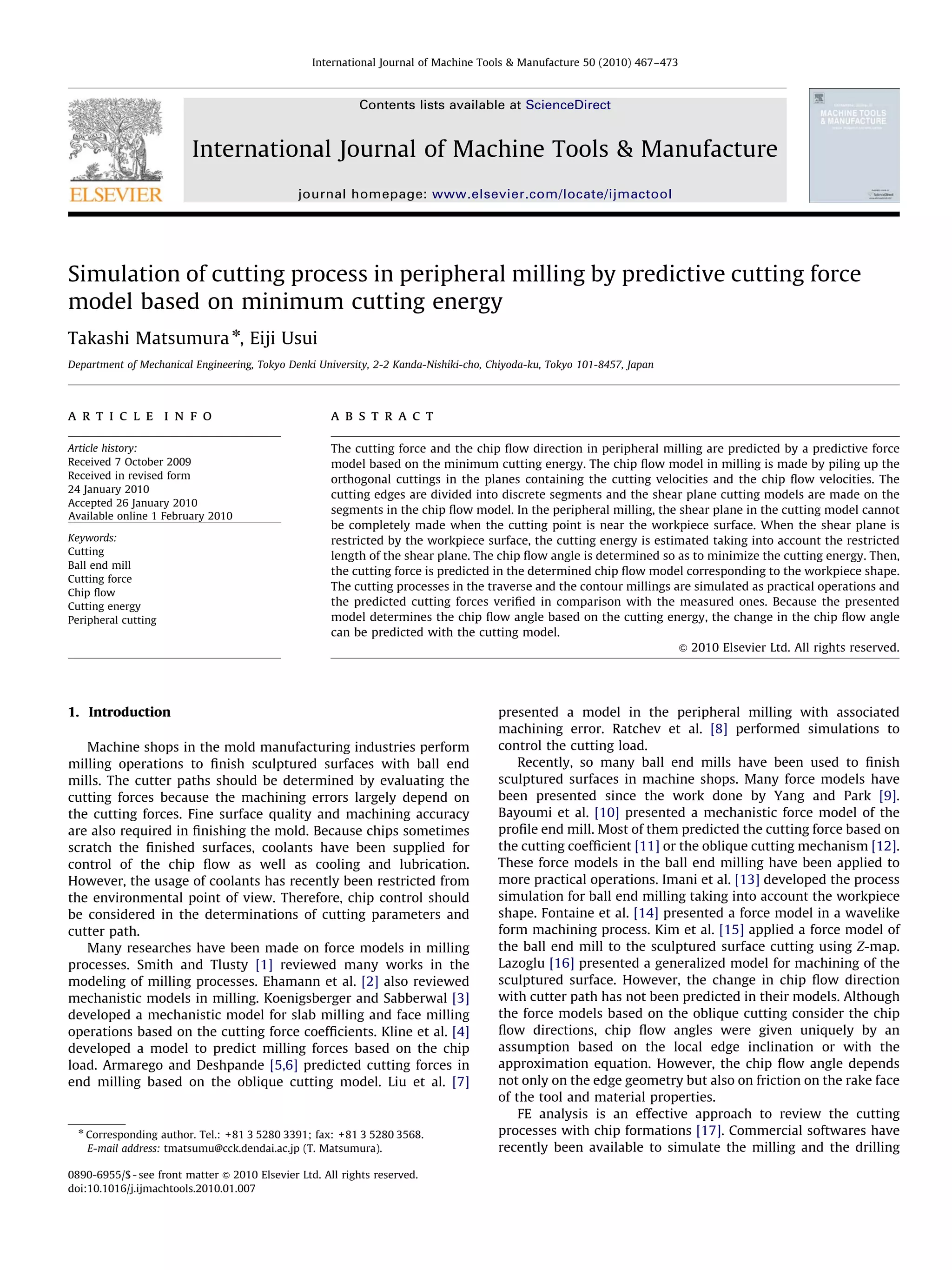 This document describes a simulation of the peripheral milling cutting process using a predictive cutting force model based on minimum cutting energy. The model divides the cutting edges into segments and establishes orthogonal cutting models on each segment. It determines the chip flow angle that minimizes the cutting energy to predict the cutting force and chip flow direction. The model accounts for when the shear plane in cutting is restricted by the workpiece surface near the edge. Simulations of traverse and contour milling processes using the model are shown to verify the predicted cutting forces.