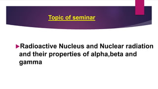 This document summarizes a student seminar presentation on radioactive nuclei and nuclear radiation. It defines radioactive nuclei as unstable nuclei that decay by emitting particles like photons, electrons, and alphas. It describes three main types of nuclear radiation: alpha particles, which are blocked by paper; beta particles, which are electrons and have more penetrating power; and gamma radiation, which are electromagnetic waves like x-rays. Examples of beneficial uses of nuclear radiation discussed include medical imaging, cancer treatment, radiometric dating, and research.