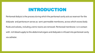 Peritoneal dialysis is a treatment for kidney failure that uses the peritoneum and peritoneal membrane to filter waste from the blood. It involves infusing dialysate into the peritoneal cavity, allowing it to dwell for a period of time to exchange wastes, and then draining the used dialysate. There are several types of peritoneal dialysis including continuous ambulatory peritoneal dialysis, automated peritoneal dialysis, and intermittent peritoneal dialysis. Nursing management involves assessing the patient pre and post dialysis, following sterile technique during the procedure, monitoring for complications, and educating the patient and family.