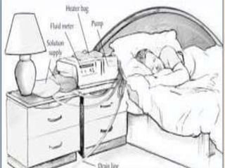 Dialysis is a clinical technique that involves the movement of fluid and solutes across a semi-permeable membrane to remove toxic substances and maintain fluid balance in patients with severe kidney disease. Peritoneal dialysis (PD) uses the patient's peritoneal membrane as a filter and includes procedures like inflow, dwell, and drain phases, which can be performed manually or with an automated cycler. Complications of PD may include infections, hernias, and nutritional deficiencies, and effective management is crucial for patient outcomes.