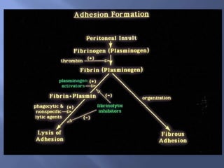 This document discusses the histology, innervation, functions, and healing process of the peritoneum. It covers the layers of the peritoneum, how it is innervated leading to pain perception, its roles in nutrient diffusion, fluid production, and waste removal. The document also summarizes the inflammatory and coagulation cascades triggered by peritoneal trauma, as well as preventative methods for reducing post-operative adhesions.