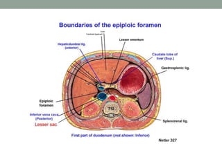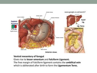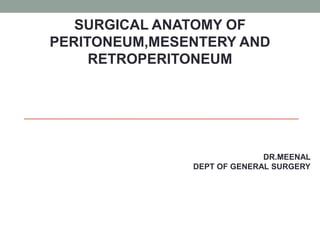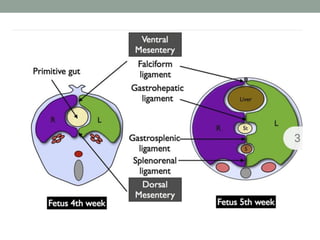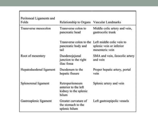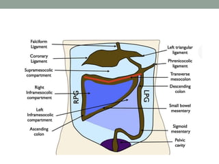 The peritoneum lines the abdominal cavity and comprises two layers. The mesentery suspends portions of the bowel and contains blood vessels, lymph nodes, and nerves. The peritoneal spaces include the lesser sac, supracolic and infracolic compartments. During development, the peritoneum and mesentery arise from the trilaminar embryo. Diseases can spread within the peritoneal cavity along ligaments, mesenteries, and lymphatics. The omentum, mesentery, and peritoneal recesses have clinical relevance for surgery and disease spread.