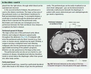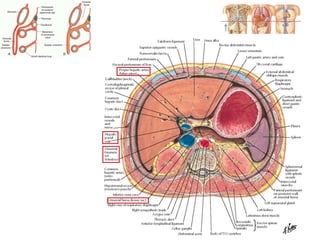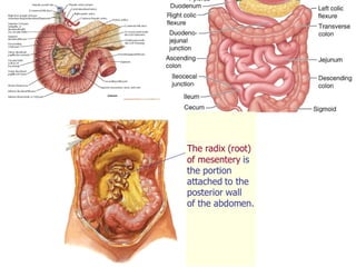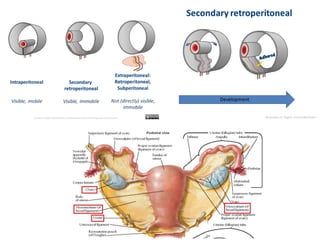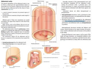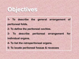 The peritoneum is a serous membrane that lines the abdominal cavity and covers the abdominal organs. It allows the organs to move freely within the cavity. The peritoneum is divided into the parietal peritoneum, which lines the abdominal wall, and the visceral peritoneum, which covers the organs. Different peritoneal folds connect organs to the walls or to other organs, including the omenta, mesentery, mesocolon, and ligaments. The peritoneal cavity is the potential space between the parietal and visceral layers that contains a small amount of fluid. It is divided into the greater and lesser sacs, with the epiploic foramen connecting them.