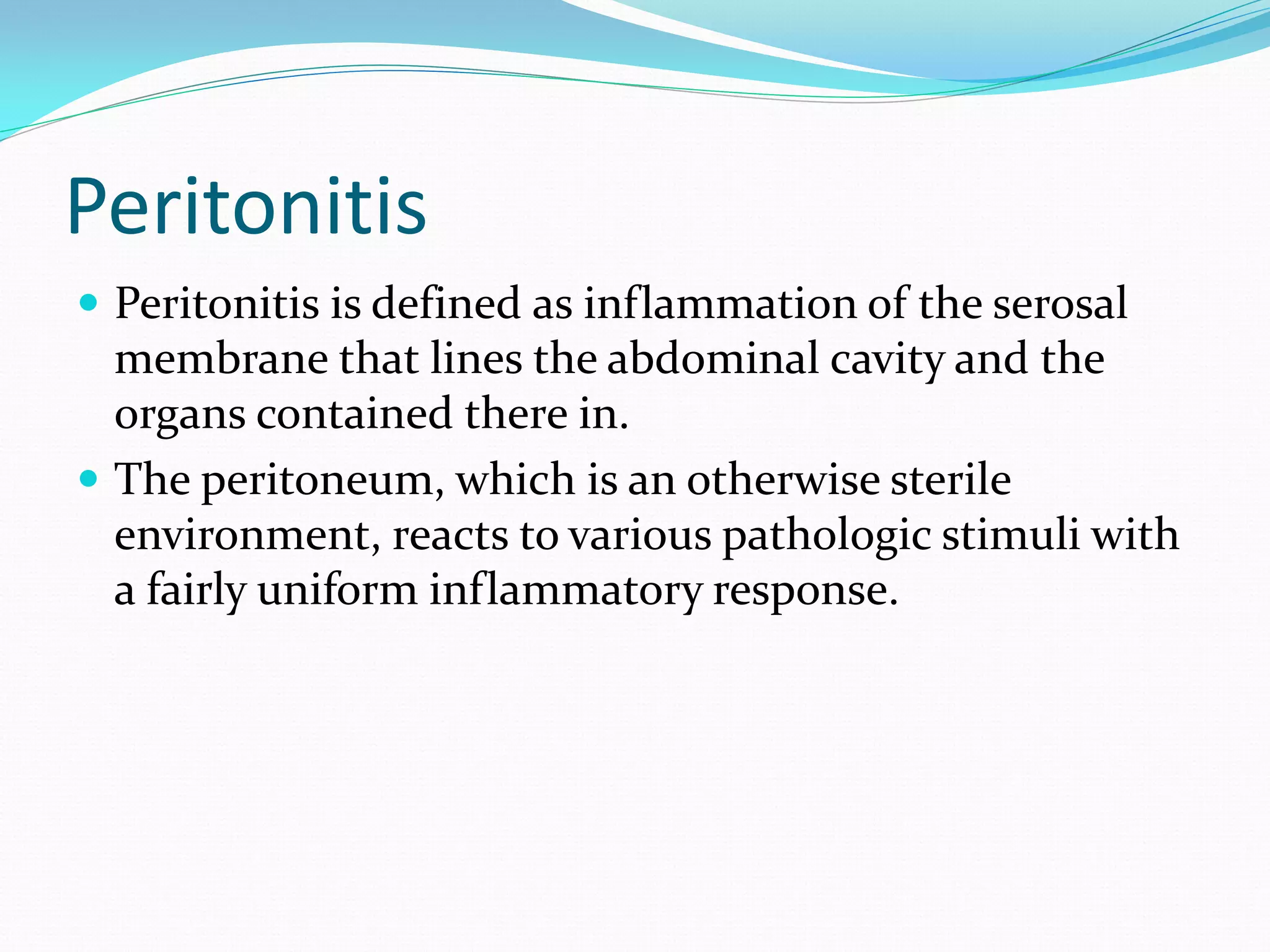 Peritonitis is inflammation of the peritoneum lining the abdominal cavity. It can be caused by infection, injury, or chemical irritation. Acute peritonitis requires prompt treatment to eliminate the infectious source and reduce bacterial load. Treatment involves intravenous antibiotics, surgery to resolve the underlying cause, and intensive care as needed. Prognosis depends on the severity and cause of peritonitis. More severe or generalized cases with organ dysfunction carry a high risk of complications and mortality.