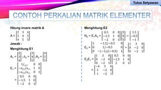 Dokumen ini membahas metode perhitungan invers matriks dan penerapannya dalam pengolahan citra digital, termasuk partisi matriks besar menjadi matriks yang lebih kecil untuk efisiensi. Terdapat penjelasan tentang operasi penjumlahan dan pengurangan matriks serta contoh perkalian matriks. Metode ini penting untuk mengatasi keterbatasan memori saat memproses citra berukuran besar.