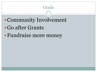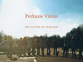 The document outlines fundraising goals and events for the future of Perkasie, including holding additional car washes, barn shows, basket bingos, and community days to raise over $1,500 so far. The ultimate goal is to involve the community and apply for grants to fundraise more money. Networks like Facebook, a website, and Tumblr are used to spread information and feedback is welcomed by contacting the provided information.