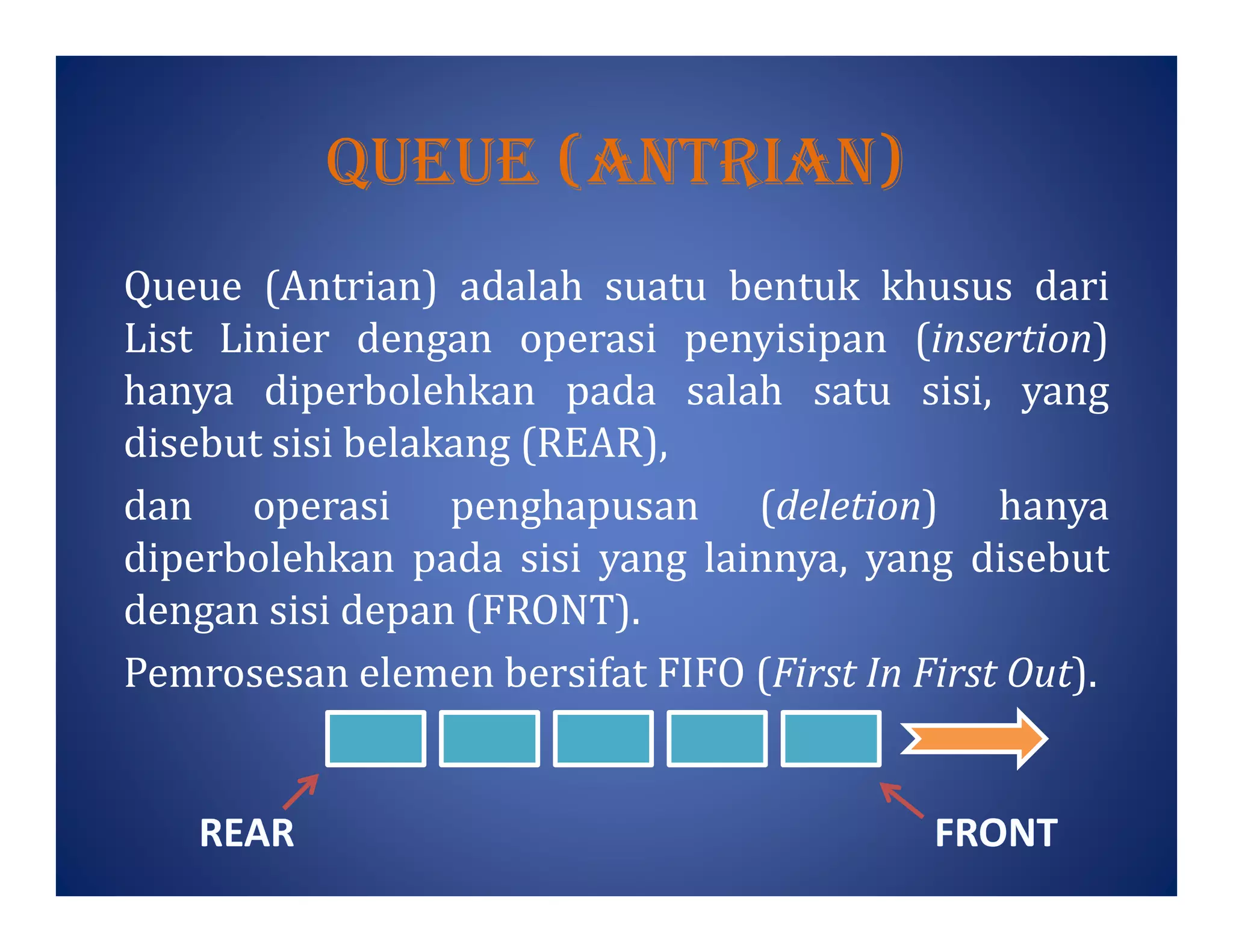 Dokumen tersebut membahas tentang antrian (queue) yang merupakan bentuk khusus dari list linier dengan operasi penyisipan hanya diizinkan di salah satu sisi (belakang) dan penghapusan hanya diizinkan di sisi lain (depan), mengikuti prinsip FIFO. Dokumen juga membahas tentang priority queue dimana elemen diproses berdasarkan tingkat prioritasnya.