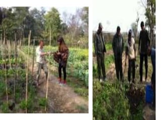 This document describes a permaculture farm in India called Parsekar Organic Farm. The farm was developed over 18 years using permaculture principles like mulching, composting, drip irrigation, and polyculture planting. The farm has a diverse food forest with over 50 varieties of mangoes, coconuts, bananas, jackfruit, berries and more growing together. The farm also practices rainwater harvesting and uses organic methods to deter pests. It provides a model of sustainable small-scale organic farming.