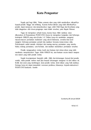 Dokumen ini adalah tugas akhir mengenai permainan tradisional Indonesia yang disusun oleh mahasiswa PGSD Universitas Sebelas Maret. Tugas ini menjelaskan berbagai jenis permainan tradisional seperti cangke', bekel, engklek, dan dakon, termasuk pengertian, cara bermain, dan manfaatnya. Tujuan dari karya ini adalah untuk meningkatkan pemahaman dan apresiasi terhadap warisan budaya permainan tradisional di Indonesia.