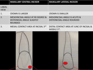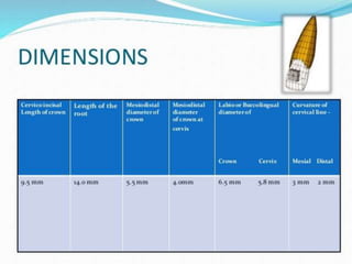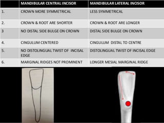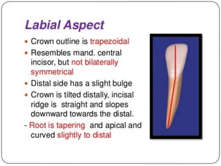 This document provides information about the mandibular lateral incisor tooth. It describes the anatomy and morphology of the mandibular lateral incisor, including its size, shape, root structure, and variations compared to the central incisor. Key details include that the lateral incisor is slightly wider than the central incisor, has a more rounded distoincisal angle, and a more cervically located height of contour and distal contact area. The document also discusses tooth numbering systems and the chronology of lateral incisor development.