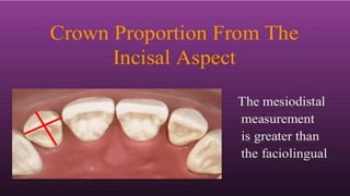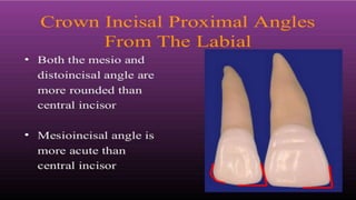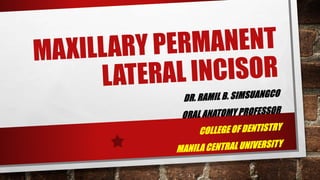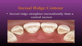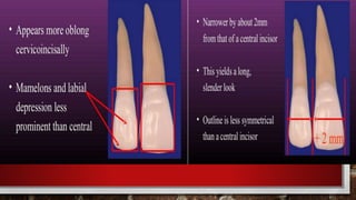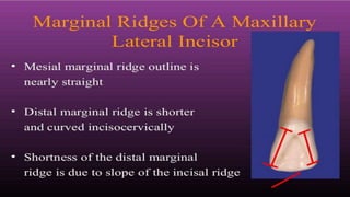 The document summarizes the key anatomical features of a maxillary lateral incisor tooth. It notes that the lateral incisor is smaller than the central incisor except for root length, and narrower from side to side. It then describes variations that can occur and provides details on features seen from the front, back, sides and biting surface of the tooth. These include shapes of ridges, angles, root curvature and positioning of contact points with neighboring teeth.