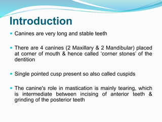 This document provides a detailed overview of canine tooth anatomy for both the maxillary and mandibular canines. It describes the key features of the crown and root for each, including their morphology, dimensions, eruption timeline, and positioning within the dental arches. The maxillary canine has a single pointed cusp and plays an intermediate role between incising and grinding. Both canines have a prominent lingual ridge and their roots taper gradually to a pointed apex.