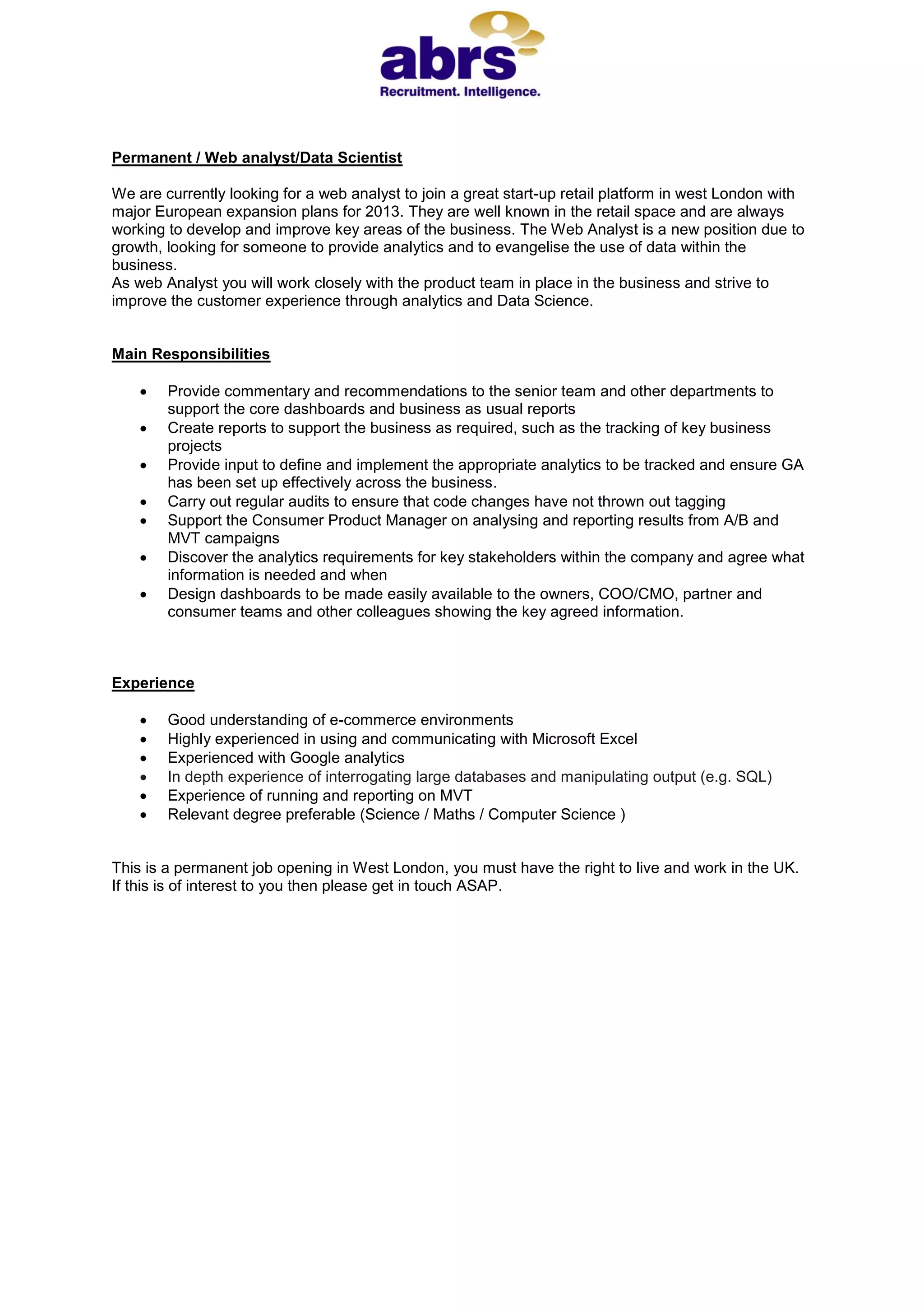This document summarizes a job posting for a web analyst position at a growing retail startup in west London. The role is new due to company growth and will involve providing analytics and data insights to improve customer experience. Responsibilities include reporting on key metrics, analyzing A/B testing results, and designing dashboards. The ideal candidate has experience with tools like Excel, Google Analytics, SQL, and multivariate testing. The permanent role is located in west London and requires the legal right to work in the UK.