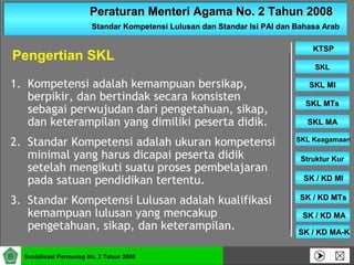 Peraturan Menteri Agama No. 2 Tahun 2008 menetapkan standar kompetensi lulusan dan standar isi untuk pendidikan agama Islam dan bahasa Arab di madrasah. Dokumen ini menjelaskan berbagai kompetensi yang harus dicapai peserta didik, termasuk aspek pengetahuan, sikap, dan keterampilan. Selain itu, dokumen ini juga memuat pedoman kurikulum untuk berbagai jenjang pendidikan, mulai dari sekolah dasar hingga menengah.