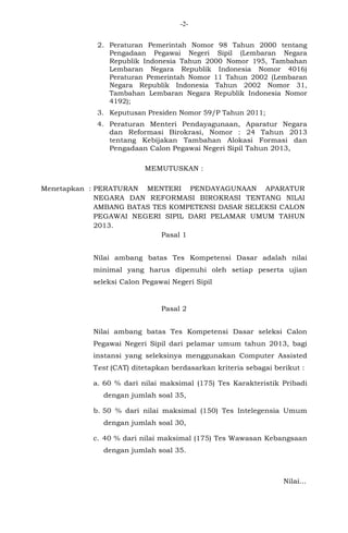 Peraturan ini menetapkan nilai ambang batas tes kompetensi dasar bagi calon pegawai negeri sipil dari pelamar umum tahun 2013. Nilai ambang batas ditetapkan berdasarkan persentase tertentu dari nilai maksimal masing-masing tes untuk instansi yang menggunakan Computer Assisted Test maupun Lembar Jawaban Komputer.