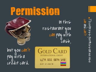 This document discusses the use of language to express permission and obligation. It provides examples of using "can" and "can't" to express permission, such as "In this restaurant you can pay with cash, but you can't pay with a credit card." It also provides examples of using "have to" and "don't have to" to express obligation or necessity, such as "If I want to graduate I have to study hard." The document then provides tables comparing affirmative and negative examples as well as questions for both permission and obligation.