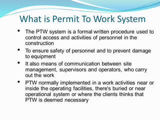 The Permit to Work (PTW) system is a formal procedure used in construction to manage access and activities, ensuring personnel safety and equipment protection. It involves various types of work permits—such as hot work, confined space, and electrical permits—each with specific safety conditions and requirements. Responsibilities are divided among permit issuers, receivers, and coordinators, all ensuring that work is conducted safely and in compliance with established protocols.