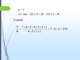 Dokumen ini membahas tentang permutasi, termasuk definisi faktorial, permutasi unsur berbeda dan sama, serta permutasi siklis. Permutasi adalah pengaturan unsur-unsur sedemikian rupa sehingga membentuk susunan tertentu.