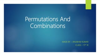 The document discusses permutations and combinations, emphasizing counting techniques useful for determining arrangements and selections of objects without listing them. It outlines fundamental principles such as the multiplication and addition principles, and defines permutations and combinations mathematically. It also includes several examples to illustrate these concepts in practical scenarios.