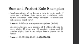 The document covers the basics of counting in permutations and combinations, illustrating concepts with examples such as transportation options, workshop selections, license plate configurations, and password formations. It explains the use of the product rule for calculating permutations p(n,r) and combinations c(n,r), detailing the differences between ordered arrangements and unordered selections. Additionally, it provides various examples to clarify how to compute these values in different scenarios.