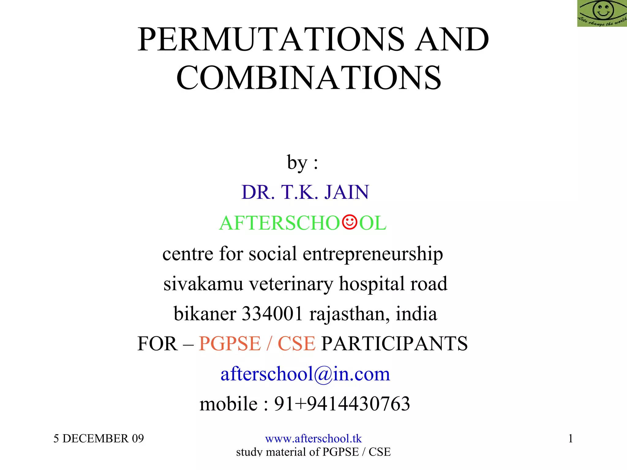 3) It poses several word problems involving permutations and combinations and shows the calculations to arrive at the answers.