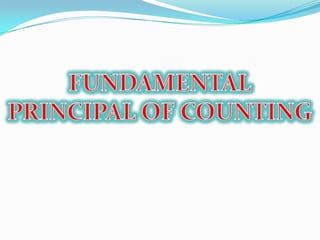 The document discusses multiplication and addition principles for counting the total number of ways an operation can be performed. It then provides an example of counting the number of 3-digit numbers that can be formed using the digits 8, 9, 2, 7 without repetition, and the numbers of those greater than 800. Permutations and combinations are also defined, with the difference being whether order matters. Various examples are given of using permutations and combinations to count arrangements and selections.