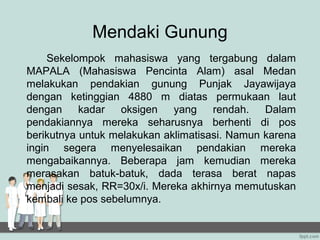 Grup mahasiswa mendaki gunung di ketinggian 4880 m diatas permukaan laut tanpa berhenti untuk aklimatisasi, menyebabkan gejala sesak napas dan batuk-batuk. Mereka akhirnya memutuskan untuk kembali ke pos sebelumnya.