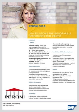 Peroni S.p.A., azienda che opera nella produzione di tessili e meccaniche per il mondo dello spettacolo, ha implementato SAP Business One per ottimizzare la gestione delle vendite e migliorare le opportunità di business. La soluzione ha permesso di sostituire un sistema obsoleto, snellire i flussi di lavoro e integrare processi complessi, migliorando la gestione delle giacenze e l'ordine di lavoro. I benefici includono un sistema integrato per il recupero dei dati in tempo reale e una gestione efficace delle varianti di prodotto.