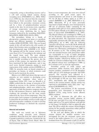The document examines the peroxidase activity in arracacha (Arracacia xanthorrhyza Bancroft) roots affected by pH and temperature. Roots were stored at 5°C to induce chilling injury and then peroxidase kinetic activity was determined under different pH and temperature conditions. The peroxidase activity was highest between pH 5.5-6.0 and at 30°C. The enzyme was more susceptible to inactivation at acidic pH levels compared to alkaline pH levels and could also be inactivated through heat treatment.