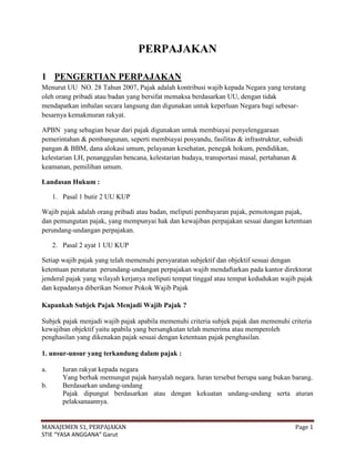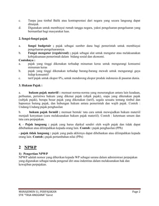Dokumen ini menjelaskan tentang perpajakan di Indonesia berdasarkan UU No. 28 Tahun 2007, termasuk pengertian pajak, kewajiban wajib pajak, dan fungsi pajak untuk pembiayaan negara serta kebijakan sosial ekonomi. Juga dibahas mengenai mekanisme pendaftaran NPWP, sanksi bagi wajib pajak yang tidak memenuhi kewajiban, dan tata cara pembayaran serta pelaporan pajak. Selain itu, dokumen ini menyoroti pentingnya pemantauan dan pemeriksaan untuk meningkatkan kepatuhan wajib pajak.